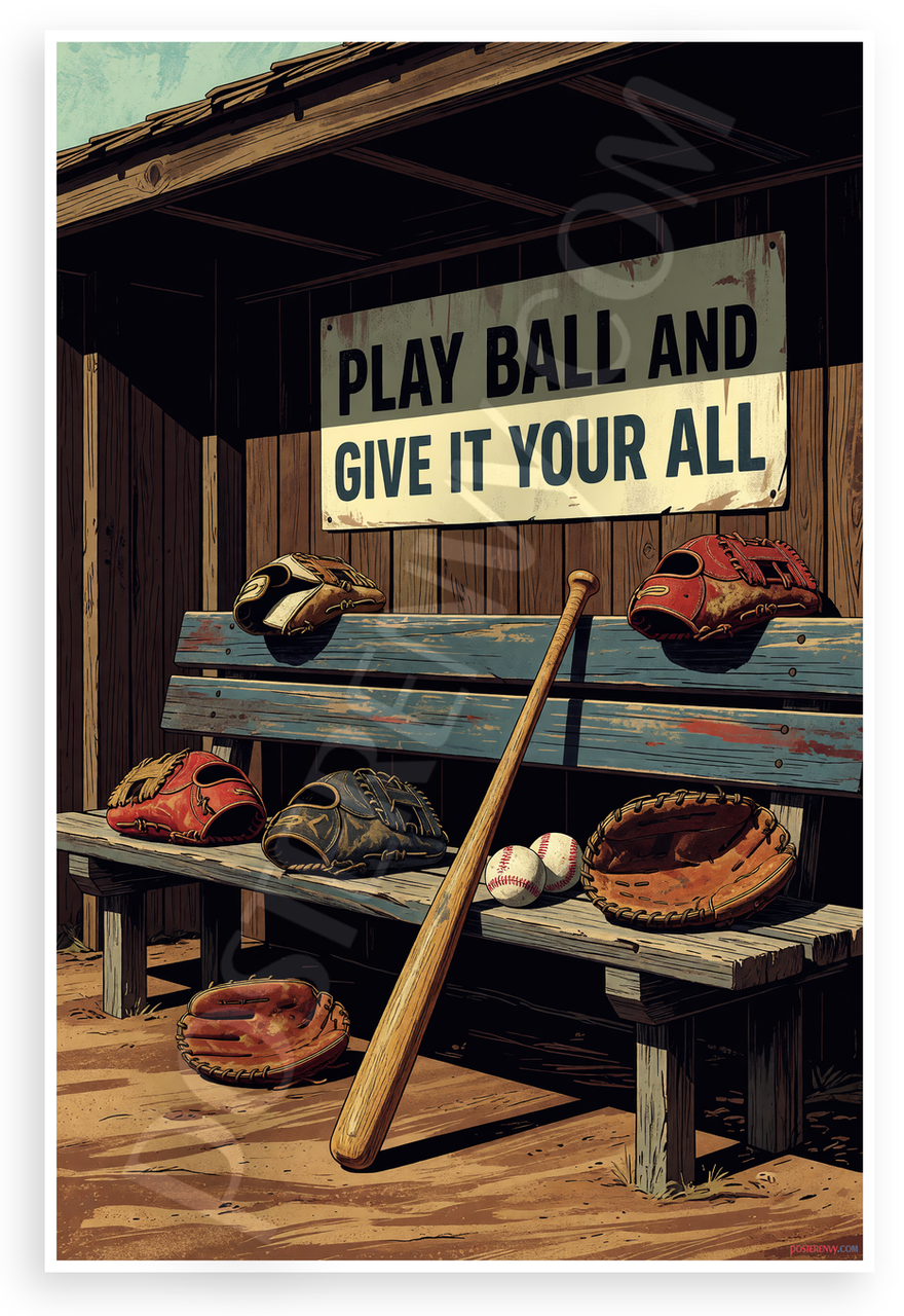 This 12x18 inch poster is printed on premium, durable paper. Proudly Made in the USA by PosterEnvy. The perfect size for any room. PosterEnvy is a family owned business, delivering top-notch posters around the world for over 20 years. Our posters are designed to last — they won't fade or pucker for years of enjoyment. Every poster features crisp, vivid artwork. We are a solar powered company. This motivational baseball poster depicts a weathered bench with assorted gloves, a wooden bat, baseballs, and a dugout sign reading Play Ball and Give It Your All in WPA-inspired vintage style with warm earth tones and dynamic composition.