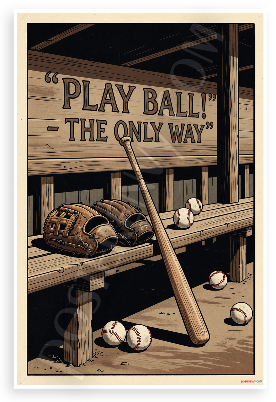 This 12x18 inch poster is printed on premium, durable paper. Proudly Made in the USA by PosterEnvy. The perfect size for any room. PosterEnvy is a family owned business, delivering top-notch posters around the world for over 20 years. Our posters are designed to last — they won't fade or pucker for years of enjoyment. Every poster features crisp, vivid artwork. We are a solar powered company. This vintage woodblock-style print depicts baseball gloves, a bat, and balls on a wooden bench under a motivational sign reading "Play Ball! - The Only Way," evoking teamwork and the love of the game in warm brown tones.