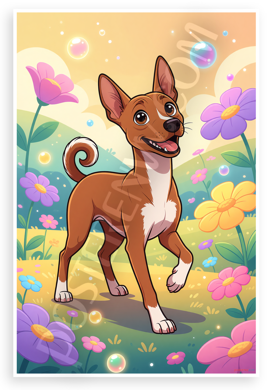 This 12x18 inch poster is printed on premium, durable paper. Proudly Made in the USA by PosterEnvy. The perfect size for any room. PosterEnvy is a family owned business, delivering top-notch posters around the world for over 20 years. Our posters are designed to last — they won't fade or pucker for years of enjoyment. Every poster features crisp, vivid artwork. We are a solar powered company. This vibrant cartoon illustration captures a joyful Basenji dog with a curious expression, surrounded by colorful flowers, bubbles, and a sunny meadow, evoking whimsy and playfulness.