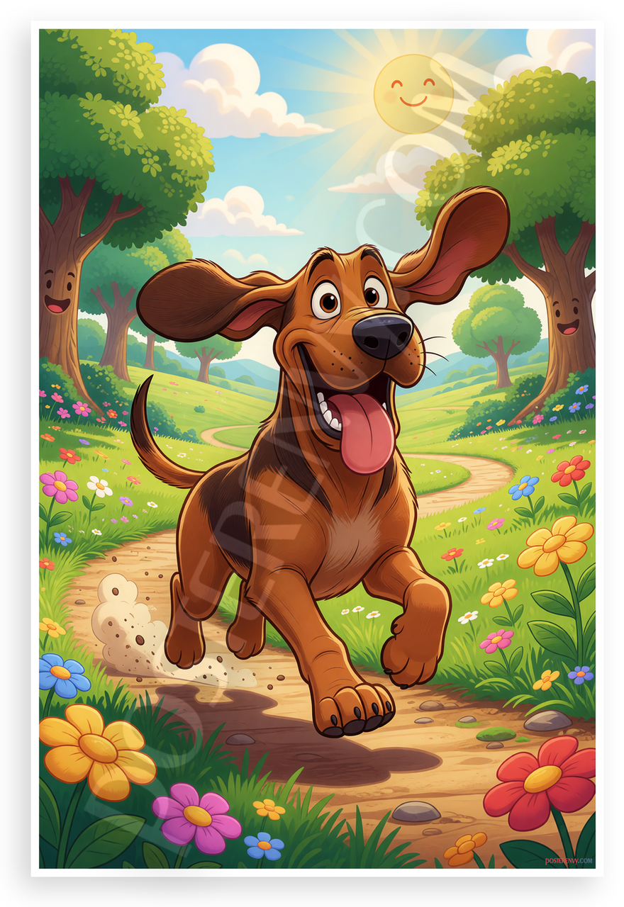 This 12x18 inch poster is printed on premium, durable paper. Proudly Made in the USA by PosterEnvy. The perfect size for any room. PosterEnvy is a family owned business, delivering top-notch posters around the world for over 20 years. Our posters are designed to last — they won't fade or pucker for years of enjoyment. Every poster features crisp, vivid artwork. We are a solar powered company. This whimsical cartoon depicts a joyful bloodhound dashing along a winding path through a vibrant meadow filled with colorful flowers, happy trees, and a smiling sun, capturing a lighthearted outdoor adventure mood.