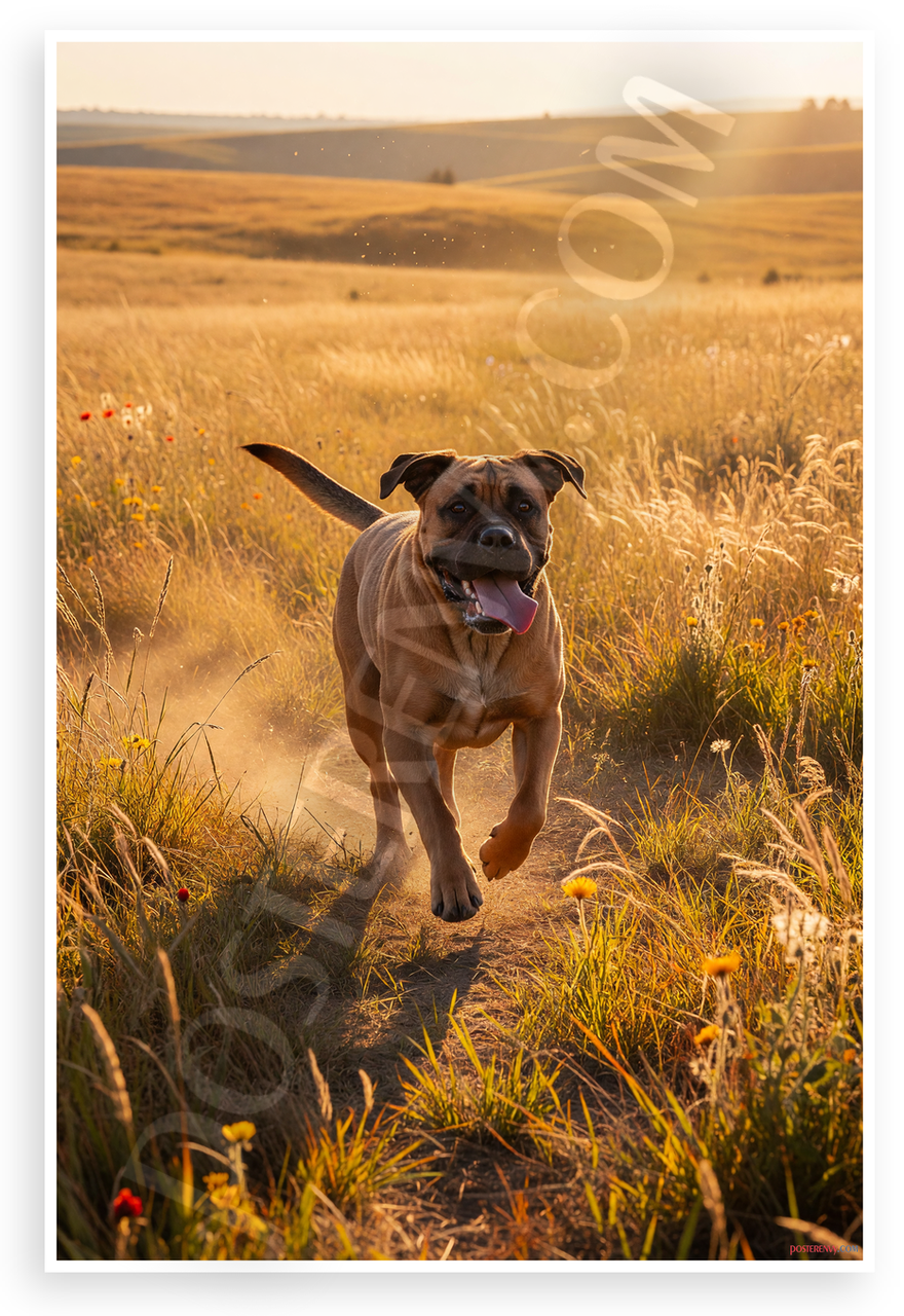 - Joyful Dog in Nature: Dynamic image of Bullmastiff bounding through tall grass and flowers under warm sunset glow, radiating energy and happiness. Perfect for living rooms, dens, or pet-themed spaces
