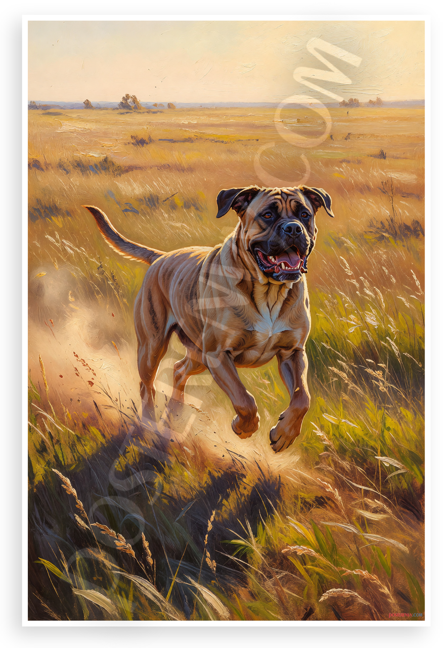 - Premium Print: This PosterEnvy 12x18 inch poster is printed on Durable, Heavy Duty Paper, Designed to last many years. Features playful Bullmastiff running in sunny field with oil painting style, golden grasses and warm sunlight.