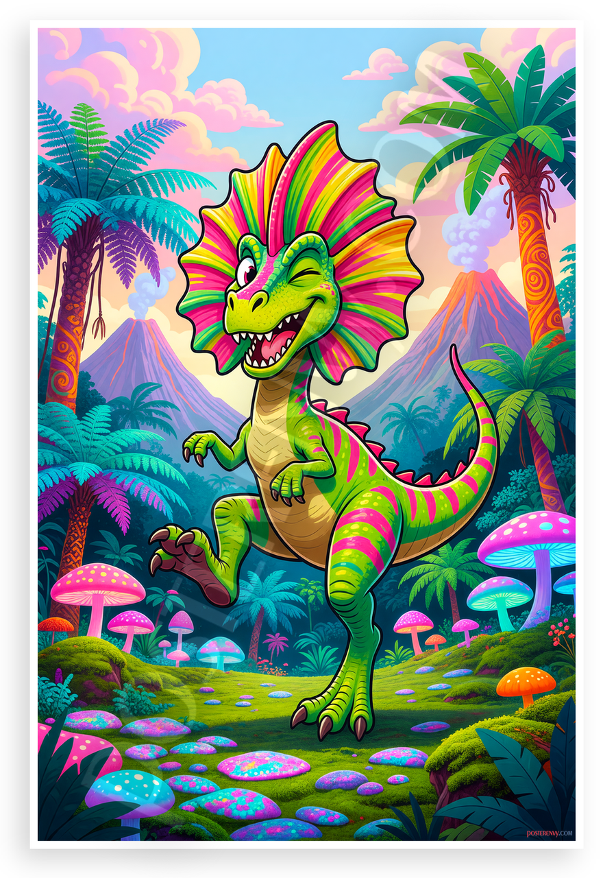 This 12x18 inch poster is printed on premium, durable paper. Proudly Made in the USA by PosterEnvy. The perfect size for any room. PosterEnvy is a family owned business, delivering top-notch posters around the world for over 20 years. Our posters are designed to last — they won't fade or pucker for years of enjoyment. Every poster features crisp, vivid artwork. We are a solar powered company. This vibrant cartoon Dilophosaurus strikes a playful pose amid lush jungle palms, colorful mushrooms, erupting volcanoes, and whimsical prehistoric scenery with bright pink, green, purple, and blue hues.