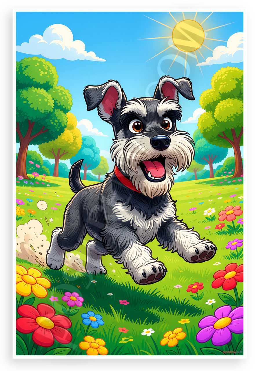 - Joyful Cartoon Scene: Energetic black and silver Miniature Schnauzer with red collar dashes through sunny field of flowers, trees and blue sky; bright, happy mood ideal for kids rooms, playrooms or pet lover spaces