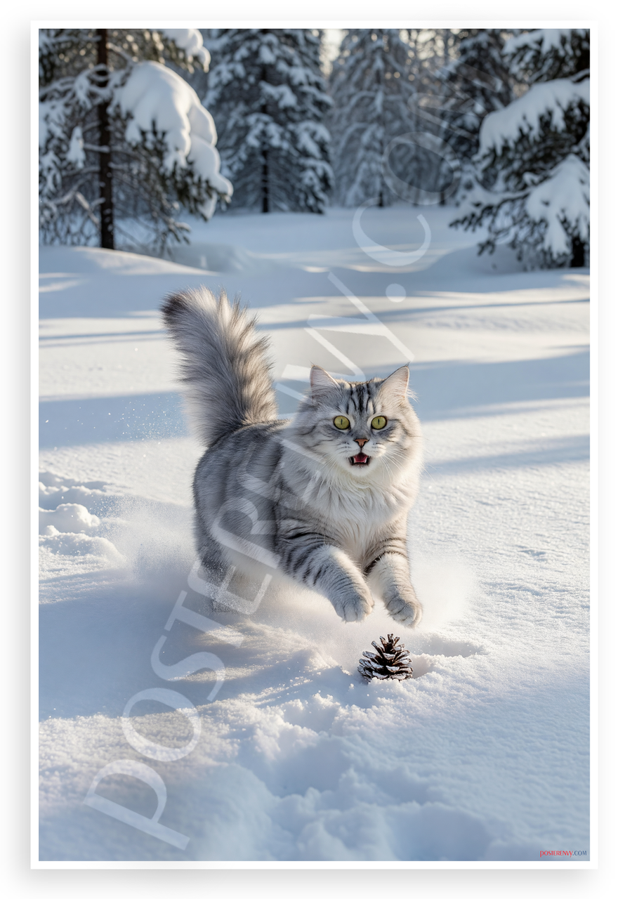 - Solar Powered Production: All our posters are designed and printed using solar energy, with crisp vivid artwork. Dynamic Siberian cat in snow, energetic animal play, pine trees backdrop.