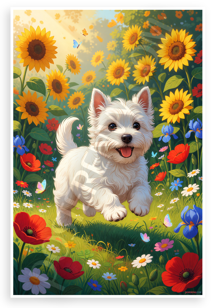 This 12x18 inch poster is printed on premium, durable paper. Proudly Made in the USA by PosterEnvy. The perfect size for any room. PosterEnvy is a family owned business, delivering top-notch posters around the world for over 20 years. Our posters are designed to last — they won't fade or pucker for years of enjoyment. Every poster features crisp, vivid artwork. We are a solar powered company. This joyful illustration captures an energetic West Highland White Terrier puppy romping through a vibrant garden filled with sunflowers, poppies, irises, butterflies, and golden sunlight. The whimsical, colorful design brings a sense of playfulness and warmth to any space.