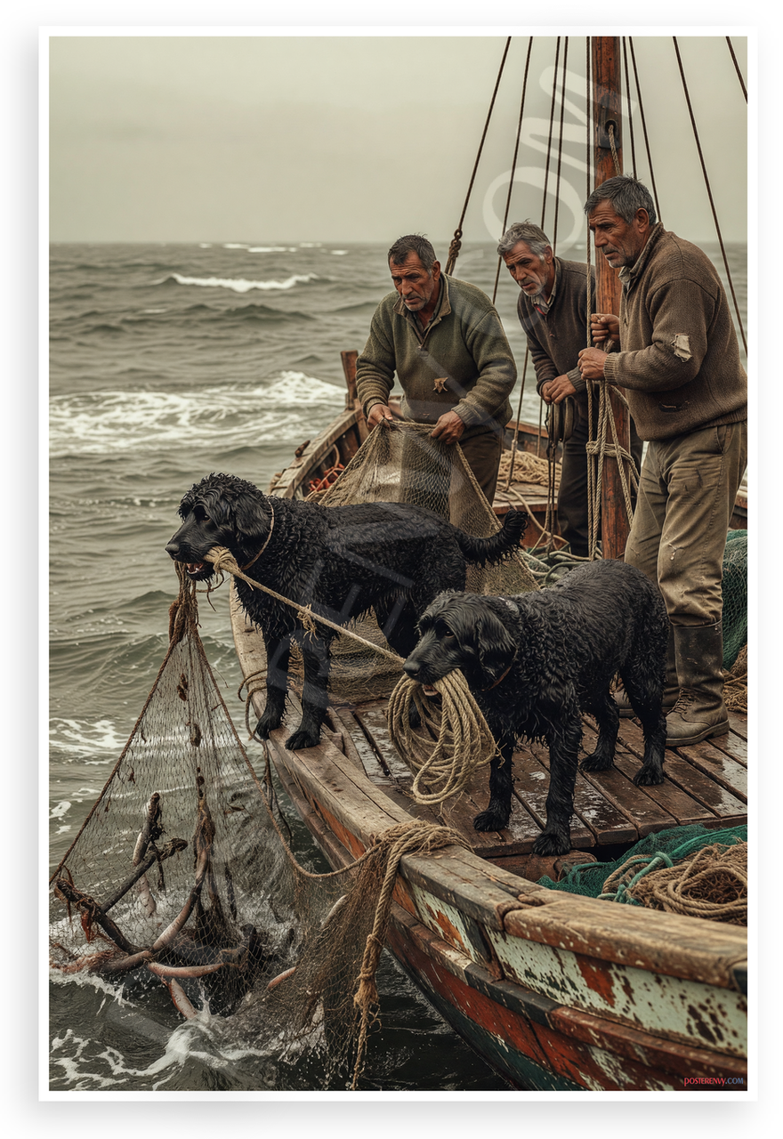 - Rugged Maritime Scene: Vintage style image shows wet black Portuguese Water Dogs and fishermen pulling fish nets on old wooden boat against stormy gray sea, ideal for coastal home office or man cave decor
