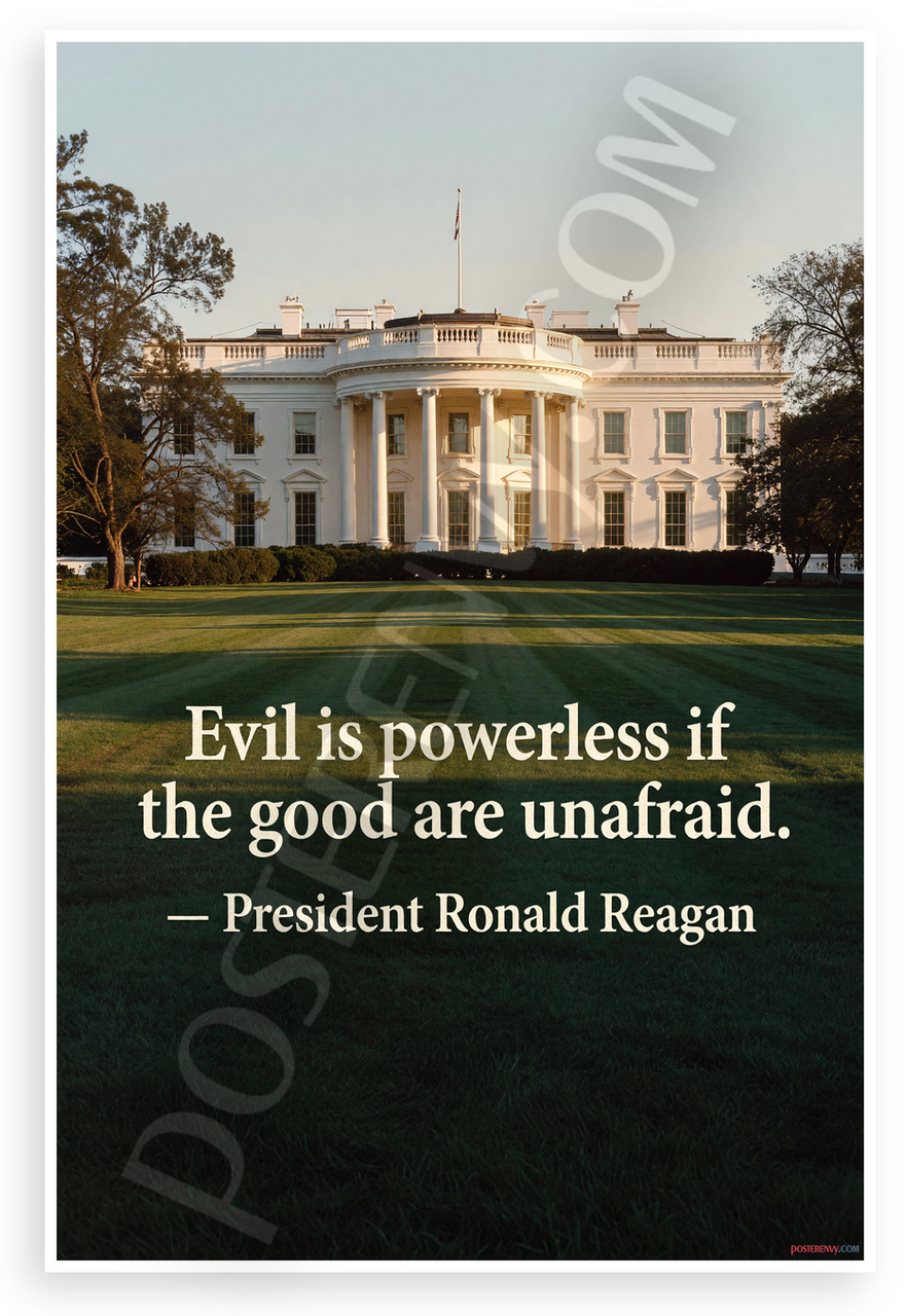 This 12x18 inch poster is printed on premium, durable paper. Proudly Made in the USA by PosterEnvy. The perfect size for any room. PosterEnvy is a family owned business, delivering top-notch posters around the world for over 20 years. Our posters are designed to last — they won't fade or pucker for years of enjoyment. Every poster features crisp, vivid artwork. We are a solar powered company. This striking poster showcases a vintage-style image of the White House with lush green lawns and trees under a soft sky, overlaid with President Ronald Reagan's powerful quote on courage against evil. Ideal for patriotic or motivational decor.