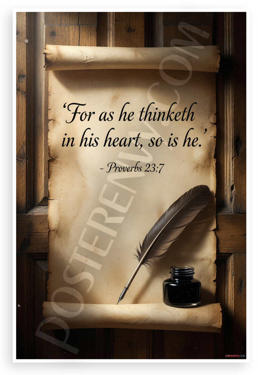 - Premium Print: This PosterEnvy 12x18 inch poster is printed on Durable, Heavy Duty Paper, Designed to last many years. Features Proverbs 23:7 quote on ancient scroll with quill and inkwell.