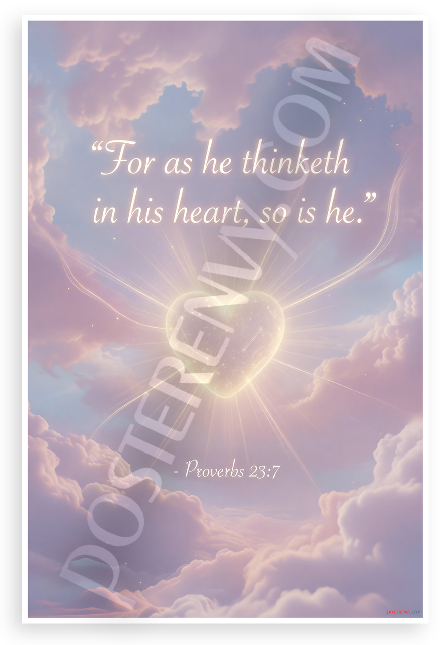 This 12x18 inch poster is printed on premium, durable paper. Proudly Made in the USA by PosterEnvy. The perfect size for any room. PosterEnvy is a family owned business, delivering top-notch posters around the world for over 20 years. Our posters are designed to last — they won't fade or pucker for years of enjoyment. Every poster features crisp, vivid artwork. We are a solar powered company. This ethereal design showcases the Bible verse Proverbs 23:7 with a glowing heart amid radiant clouds in soft pink and blue tones, evoking serenity and motivation. Ideal for uplifting any space with its heavenly glow and inspirational message.