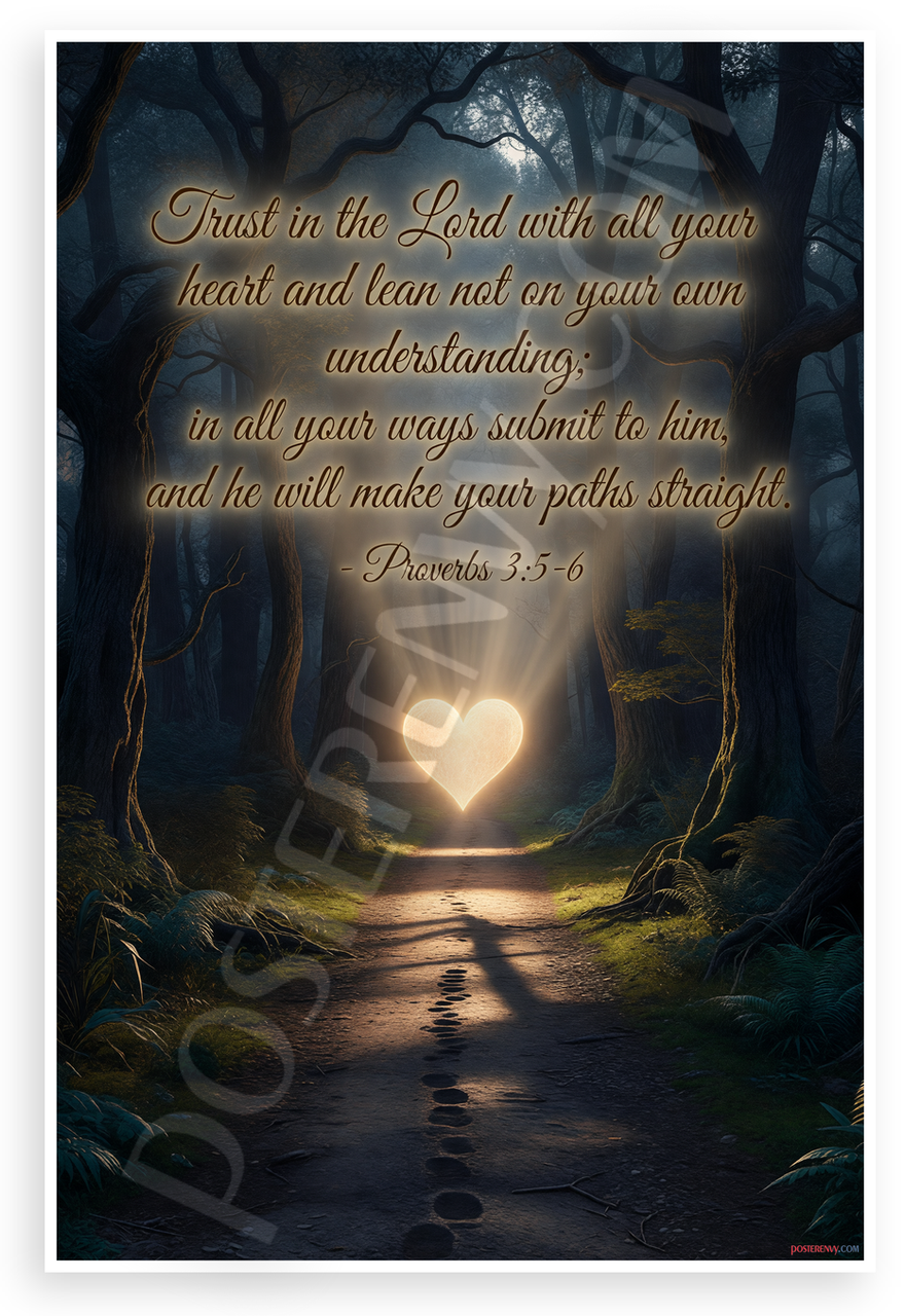 This 12x18 inch poster is printed on premium, durable paper. Proudly Made in the USA by PosterEnvy. The perfect size for any room. PosterEnvy is a family owned business, delivering top-notch posters around the world for over 20 years. Our posters are designed to last — they won't fade or pucker for years of enjoyment. Every poster features crisp, vivid artwork. We are a solar powered company. This inspirational design depicts a glowing heart-shaped light illuminating a straight forest path amid dark trees, with the full Proverbs 3:5-6 Bible verse in elegant calligraphy, evoking faith, guidance, and spiritual trust.