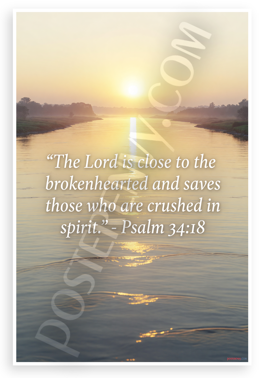 - Premium Print: This PosterEnvy 12x18 inch poster is printed on Durable, Heavy Duty Paper, Designed to last many years. Features Psalm 34:18 Bible quote on river sunset landscape