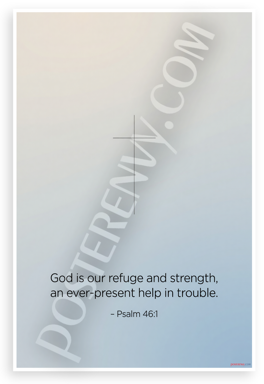 - Minimalist Faith Design: Serene cross on subtle gradients with 'God is our refuge and strength, an ever-present help in trouble - Psalm 46:1' in clean typography. Ideal for prayer rooms, home offices, or bedrooms seeking peaceful spiritual ambiance