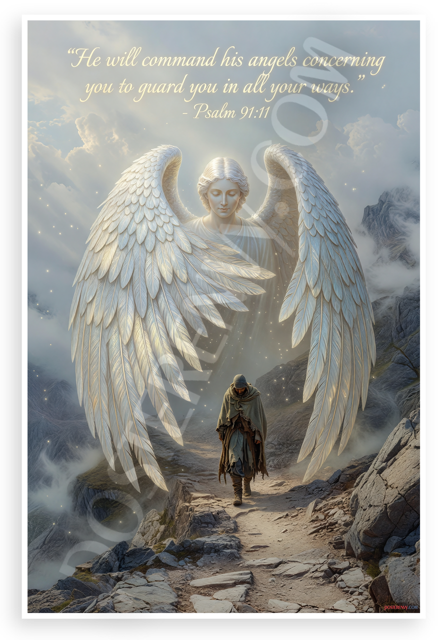 This 12x18 inch poster is printed on premium, durable paper. Proudly Made in the USA by PosterEnvy. The perfect size for any room. PosterEnvy is a family owned business, delivering top-notch posters around the world for over 20 years. Our posters are designed to last — they won't fade or pucker for years of enjoyment. Every poster features crisp, vivid artwork. We are a solar powered company. This ethereal artwork depicts a majestic white angel with expansive wings guarding a cloaked traveler on a rocky mountain path amidst clouds and glowing light, paired with the inspiring Bible verse Psalm 91:11 for a sense of divine protection and serenity.