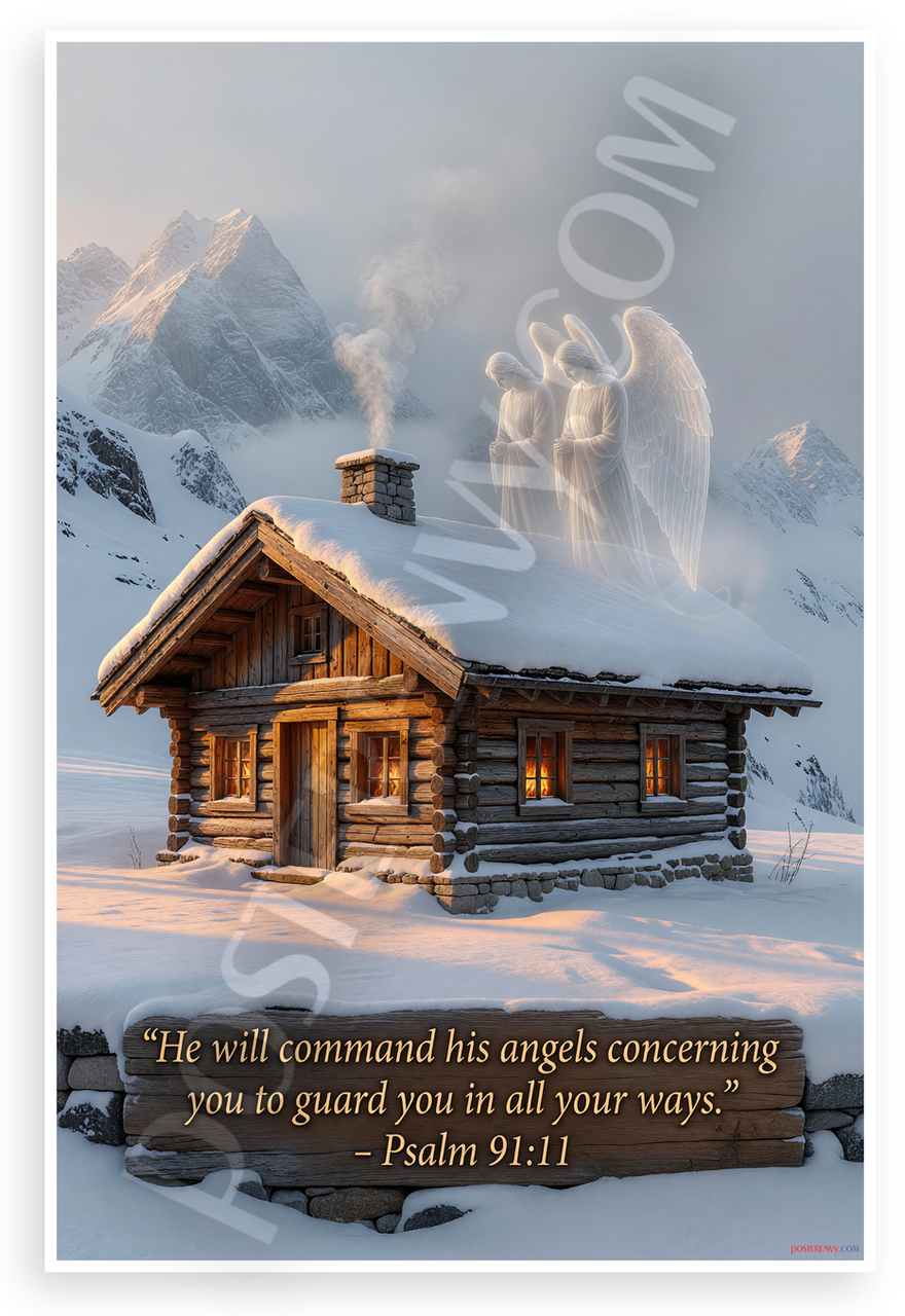 This 12x18 inch poster is printed on premium, durable paper. Proudly Made in the USA by PosterEnvy. The perfect size for any room. PosterEnvy is a family owned business, delivering top-notch posters around the world for over 20 years. Our posters are designed to last — they won't fade or pucker for years of enjoyment. Every poster features crisp, vivid artwork. We are a solar powered company. This serene winter scene depicts a cozy log cabin nestled in snow-covered Swiss Alps mountains, with glowing windows, chimney smoke, and ethereal guardian angels watching over, paired with the comforting Bible verse from Psalm 91:11 evoking divine protection and peace.