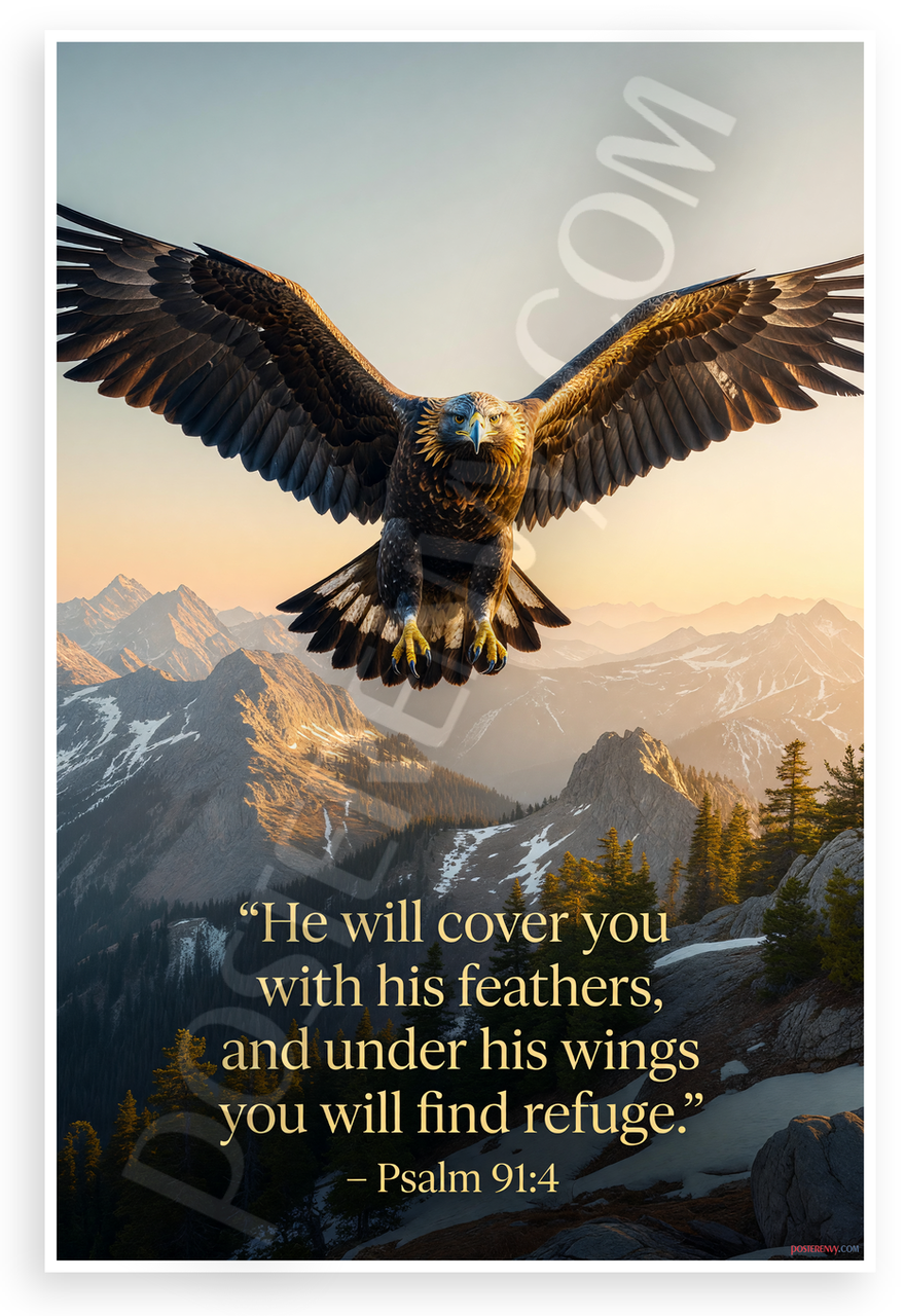 This 12x18 inch poster is printed on premium, durable paper. Proudly Made in the USA by PosterEnvy. The perfect size for any room. PosterEnvy is a family owned business, delivering top-notch posters around the world for over 20 years. Our posters are designed to last — they won't fade or pucker for years of enjoyment. Every poster features crisp, vivid artwork. We are a solar powered company. Featuring a majestic eagle soaring with outstretched wings over snow-capped mountain peaks at sunset, this design symbolizes divine protection and peace with the Bible verse Psalm 91:4 elegantly overlaid.