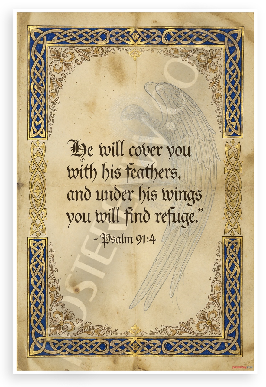 - Ornate Illuminated Design: Elegant calligraphy of Psalm 91:4 'He will cover you with his feathers, and under his wings you will find refuge' with subtle angel wings, gold blue borders on aged parchment; serene spiritual mood ideal for prayer rooms, bedrooms, churches
