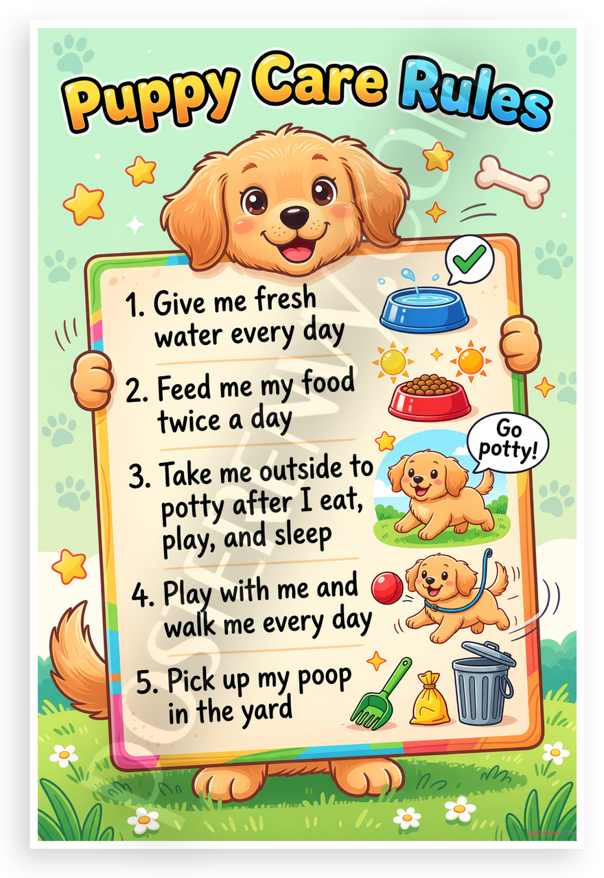 This 12x18 inch poster is printed on premium, durable paper. Proudly Made in the USA by PosterEnvy. The perfect size for any room. PosterEnvy is a family owned business, delivering top-notch posters around the world for over 20 years. Our posters are designed to last — they won't fade or pucker for years of enjoyment. Every poster features crisp, vivid artwork. We are a solar powered company. Featuring whimsical Puppy Care Rules with a joyful golden retriever puppy holding a sign listing five essential care tips: fresh water daily, twice-daily feeding, potty breaks after eating playing sleeping, daily play and walks, and yard cleanup. Playful cartoon style with vibrant colors and cute icons like bowls, balls, and scoops.