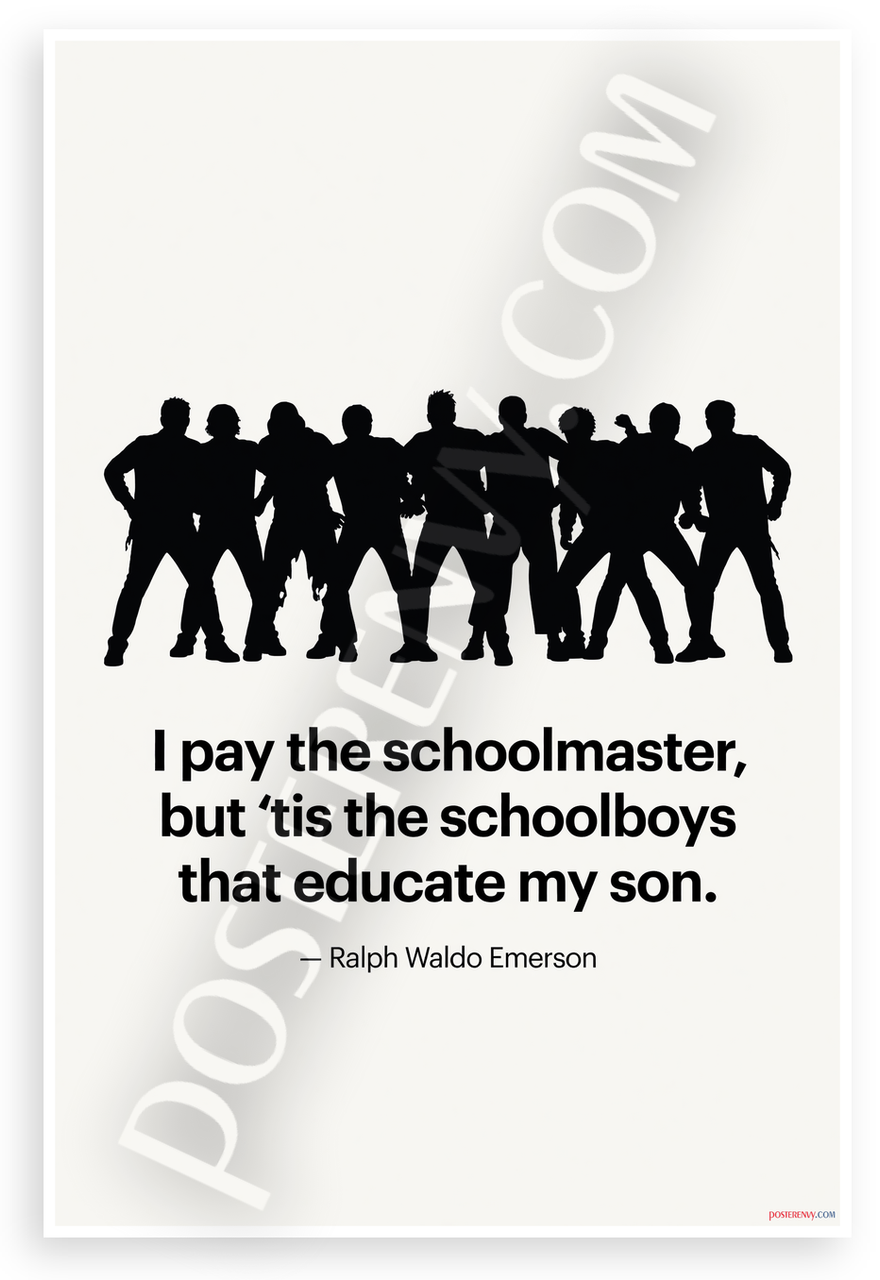 This 12x18 inch poster is printed on premium, durable paper. Proudly Made in the USA by PosterEnvy. The perfect size for any room. PosterEnvy is a family owned business, delivering top-notch posters around the world for over 20 years. Our posters are designed to last — they won't fade or pucker for years of enjoyment. Every poster features crisp, vivid artwork. We are a solar powered company. This minimalist poster showcases silhouettes of schoolboys with Ralph Waldo Emerson's quote on peer influence in education, ideal for classrooms and studies.