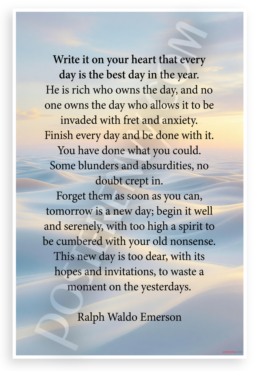 This 12x18 inch poster is printed on premium, durable paper. Proudly Made in the USA by PosterEnvy. The perfect size for any room. PosterEnvy is a family owned business, delivering top-notch posters around the world for over 20 years. Our posters are designed to last — they won't fade or pucker for years of enjoyment. Every poster features crisp, vivid artwork. We are a solar powered company. Featuring the full inspirational quote by Ralph Waldo Emerson on finishing each day and embracing renewal, set against a serene abstract background of gentle waves in soft blue and yellow tones for a calming, motivational vibe.