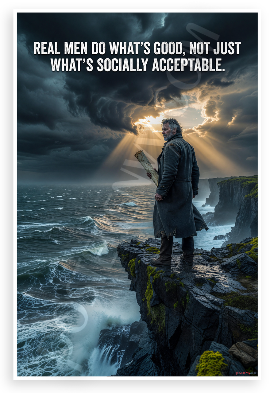 This 12x18 inch poster is printed on premium, durable paper. Proudly Made in the USA by PosterEnvy. The perfect size for any room. PosterEnvy is a family owned business, delivering top-notch posters around the world for over 20 years. Our posters are designed to last — they won't fade or pucker for years of enjoyment. Every poster features crisp, vivid artwork. We are a solar powered company. This dramatic motivational poster depicts a solitary man in a long coat standing resolute on a cliff edge overlooking a stormy sea, with rays of light breaking through dark clouds and a bold quote overlay emphasizing virtue over conformity. The vintage-inspired scene evokes strength, direction, and timeless wisdom.