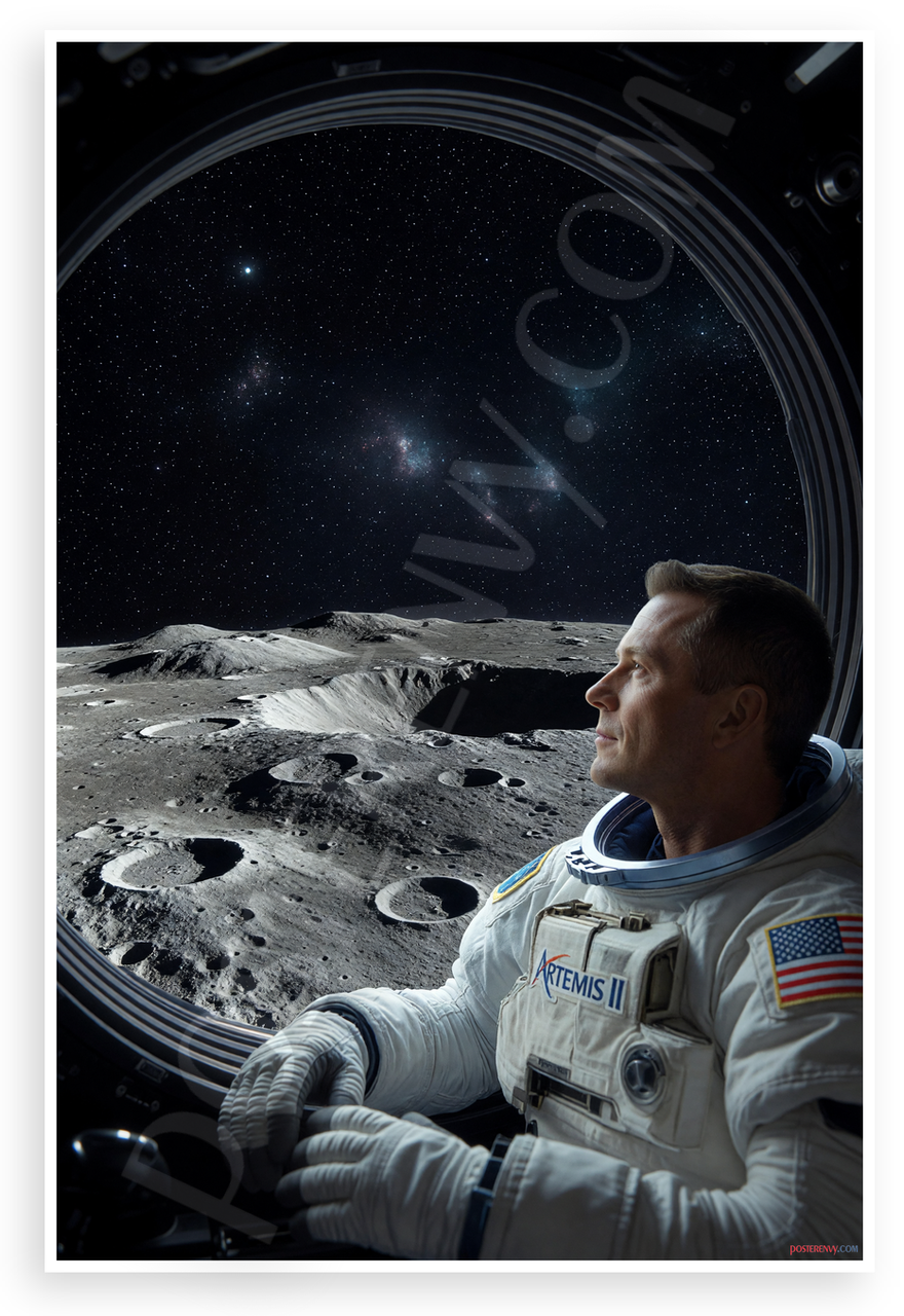 This 12x18 inch poster is printed on premium, durable paper. Proudly Made in the USA by PosterEnvy. The perfect size for any room. PosterEnvy is a family owned business, delivering top-notch posters around the world for over 20 years. Our posters are designed to last — they won't fade or pucker for years of enjoyment. Every poster features crisp, vivid artwork. We are a solar powered company. This stunning space poster captures NASA astronaut Reid Wiseman in the Artemis II spacecraft, gazing at the moon's cratered surface through a window with stars and nebulae in the background. It evokes wonder and human achievement in space exploration.