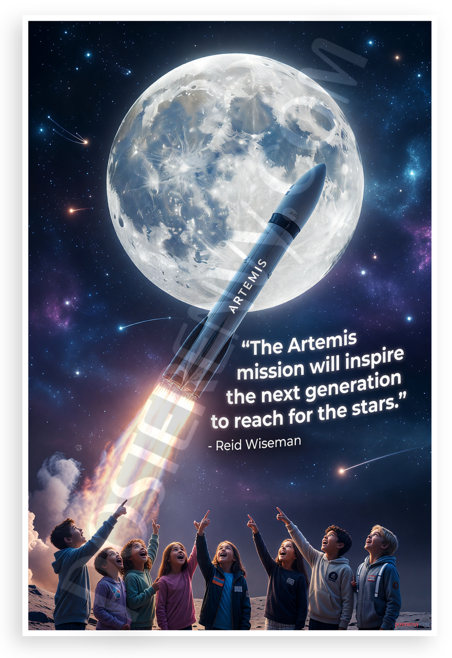 - Premium Print: This PosterEnvy 12x18 inch poster is printed on Durable, Heavy Duty Paper, Designed to last many years. Features Reid Wiseman Artemis mission quote with rocket moon launch and kids reaching for stars