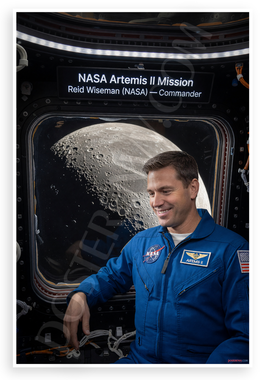 - Spacecraft Moon Scene: Reid Wiseman in NASA blue uniform smiles at lunar view through window, with Artemis II signage and American flag patch, triumphant mood for office or bedroom.