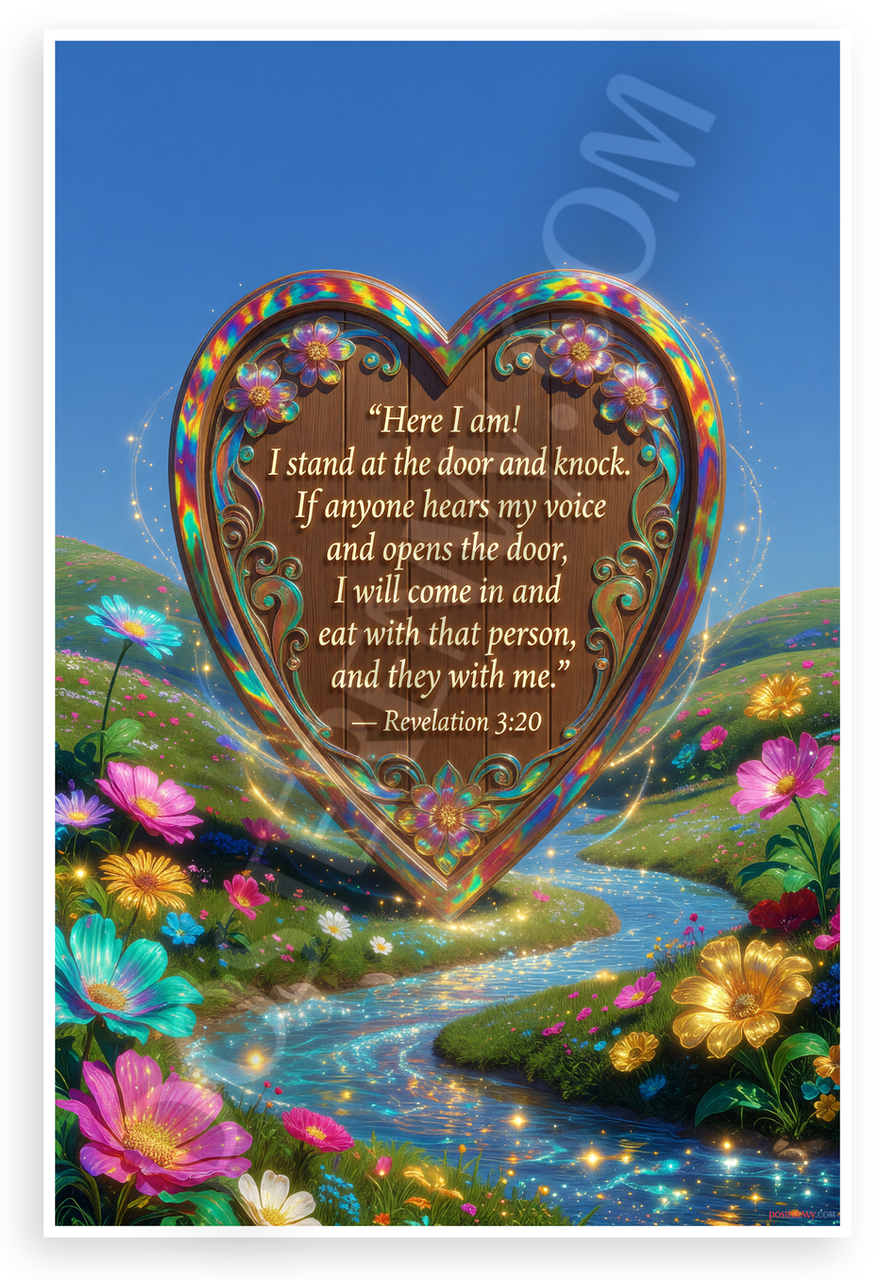 - Premium Print: This PosterEnvy 12x18 inch poster is printed on Durable, Heavy Duty Paper, Designed to last many years featuring Revelation 3:20 Bible verse heart door landscape