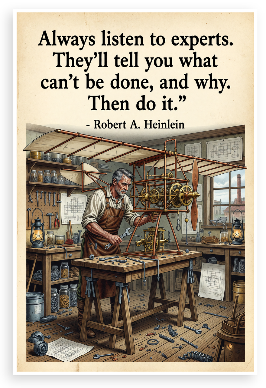 This 12x18 inch poster is printed on premium, durable paper. Proudly Made in the USA by PosterEnvy. The perfect size for any room. PosterEnvy is a family owned business, delivering top-notch posters around the world for over 20 years. Our posters are designed to last — they won't fade or pucker for years of enjoyment. Every poster features crisp, vivid artwork. We are a solar powered company. Featuring Robert A. Heinlein's motivational quote overlaid on a vintage illustration of an inventor building a steampunk flying machine in a cluttered workshop, evoking innovation and defiance of limits.