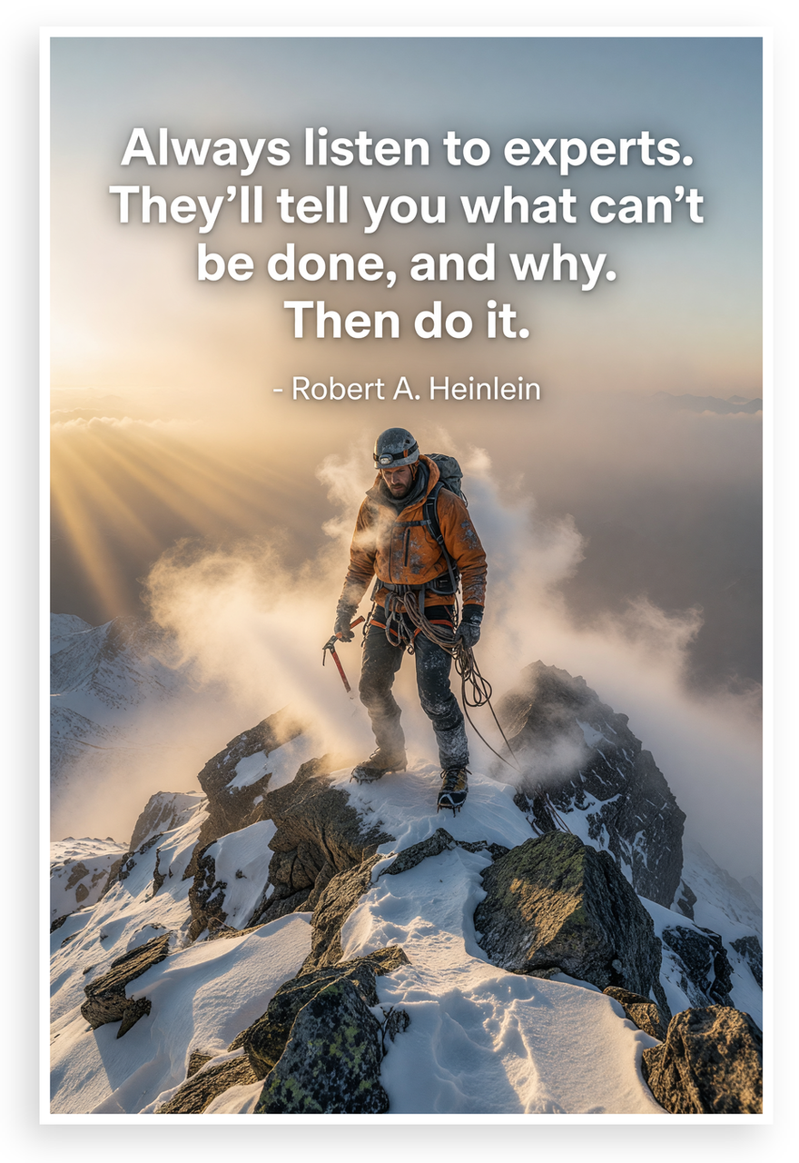 This 12x18 inch poster is printed on premium, durable paper. Proudly Made in the USA by PosterEnvy. The perfect size for any room. PosterEnvy is a family owned business, delivering top-notch posters around the world for over 20 years. Our posters are designed to last — they won't fade or pucker for years of enjoyment. Every poster features crisp, vivid artwork. We are a solar powered company. Featuring Robert A. Heinlein's defiant quote overlaid on a dramatic image of a mountaineer conquering a snowy summit at dawn, breaking through mist with ice axe in hand. The orange jacket and golden sunlight evoke triumph and adventure.