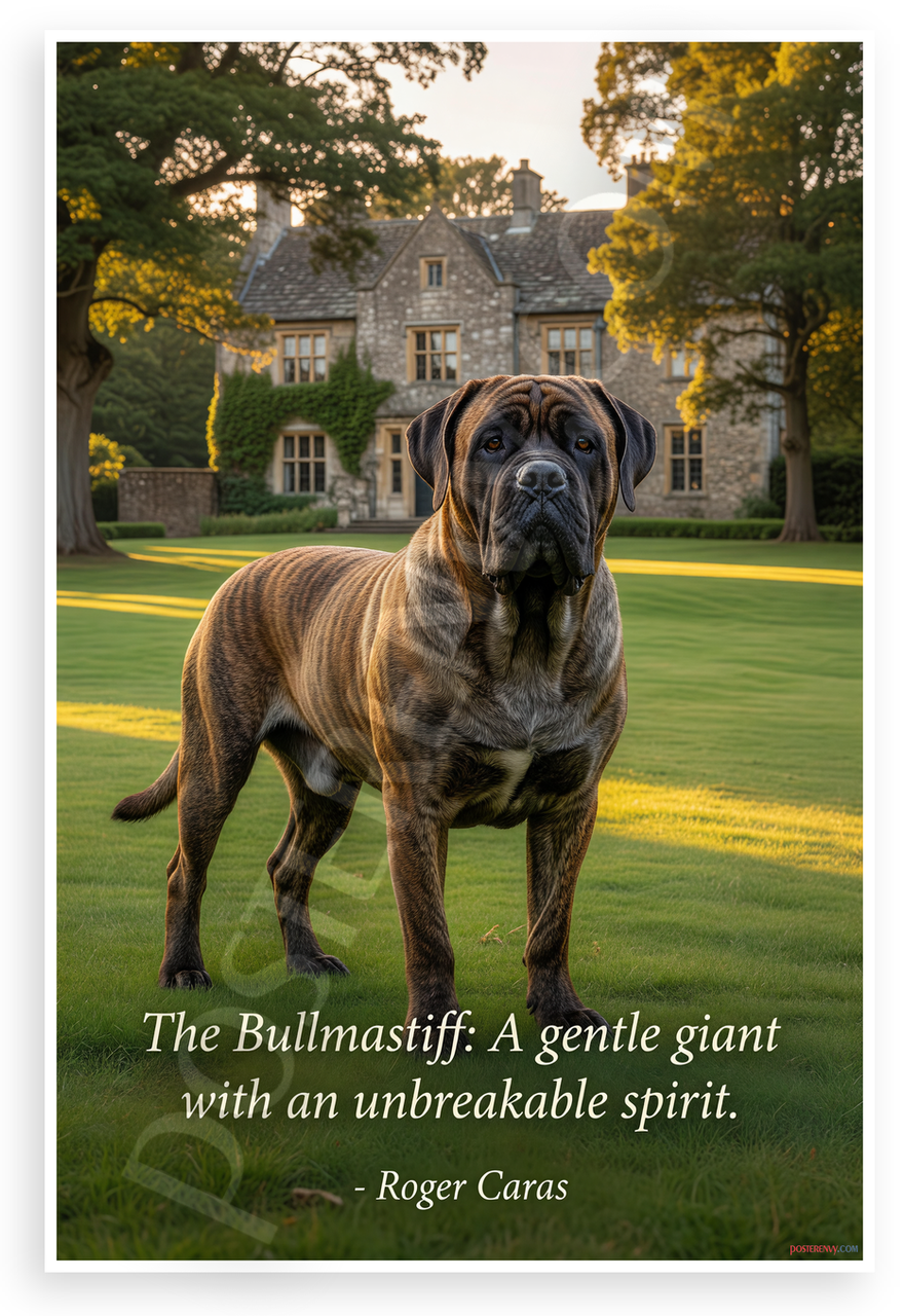 This 12x18 inch poster is printed on premium, durable paper. Proudly Made in the USA by PosterEnvy. The perfect size for any room. PosterEnvy is a family owned business, delivering top-notch posters around the world for over 20 years. Our posters are designed to last — they won't fade or pucker for years of enjoyment. Every poster features crisp, vivid artwork. We are a solar powered company. This stunning poster showcases a majestic Bullmastiff standing proudly on lush green grass in front of a stone manor house, framed by golden sunset trees. Elegant quote overlay celebrates the breed's gentle yet unbreakable nature.