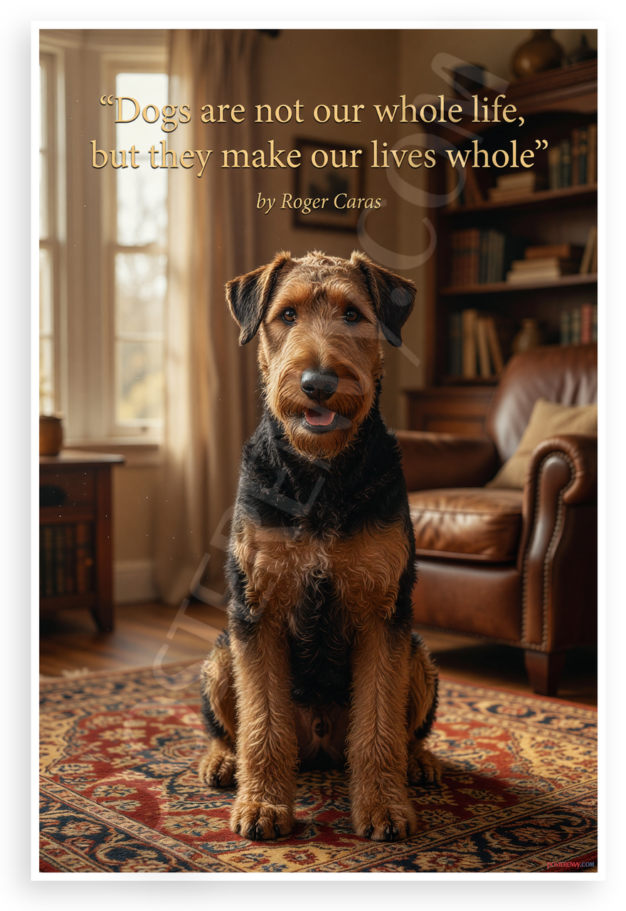 - Premium Print: This PosterEnvy 12x18 inch poster is printed on Durable, Heavy Duty Paper, Designed to last many years. Features Airedale Terrier dog portrait with Roger Caras quote in warm library setting