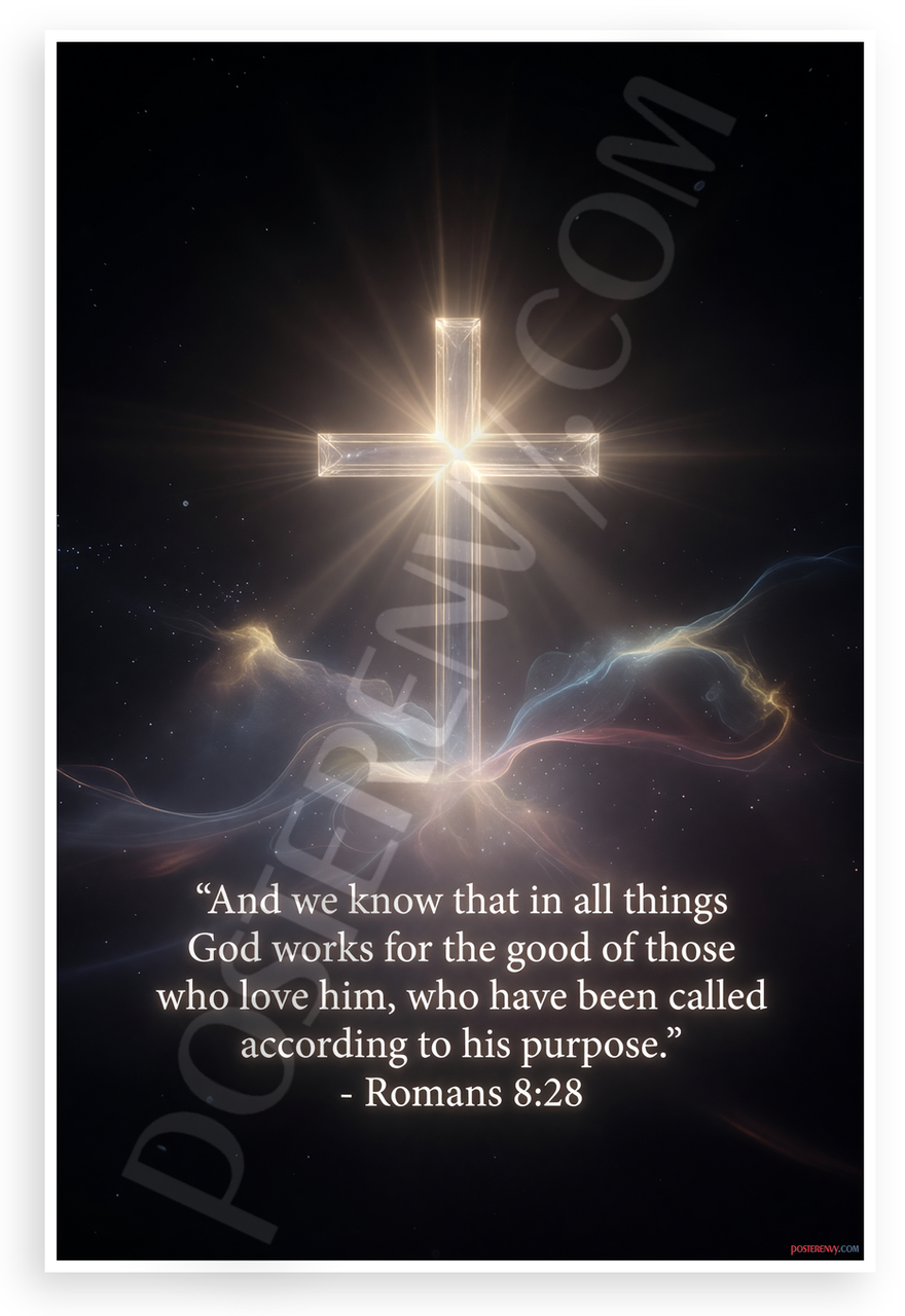 - Premium Print: This PosterEnvy 12x18 inch poster is printed on Durable, Heavy Duty Paper, Designed to last many years with glowing cross and Romans 8:28 Bible verse