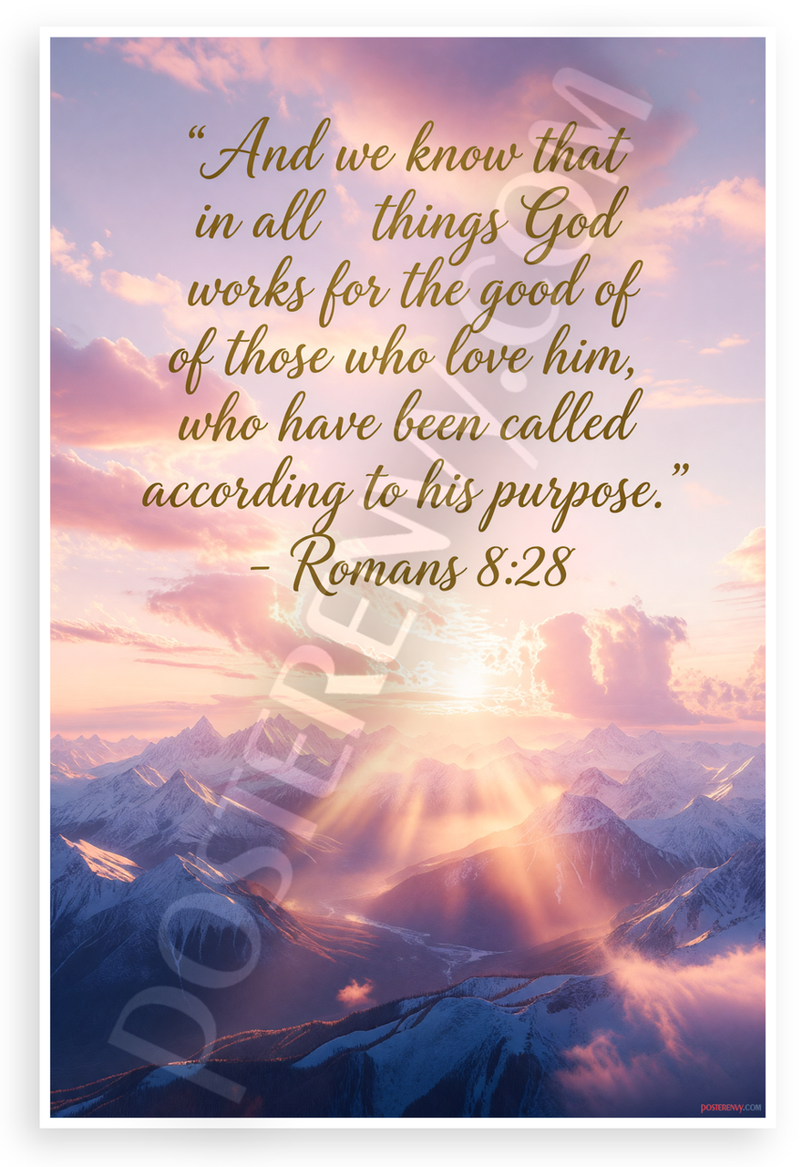 - Premium Print: This PosterEnvy 12x18 inch poster is printed on Durable, Heavy Duty Paper, Designed to last many years. Features Romans 8:28 Bible quote on mountain sunrise landscape
