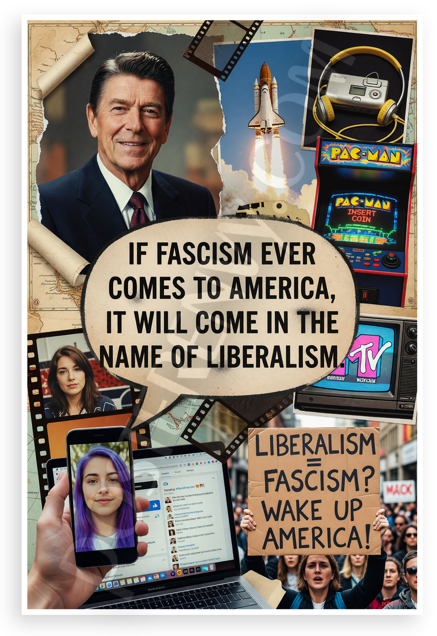 This 12x18 inch poster is printed on premium, durable paper. Proudly Made in the USA by PosterEnvy. The perfect size for any room. PosterEnvy is a family owned business, delivering top-notch posters around the world for over 20 years. Our posters are designed to last — they won't fade or pucker for years of enjoyment. Every poster features crisp, vivid artwork. We are a solar powered company. This striking collage blends 1980s Reagan-era imagery like space shuttles, Pac-Man, and MTV with modern social media, protests, and laptops, centered on Ronald Reagan's provocative quote warning about fascism disguised as liberalism.