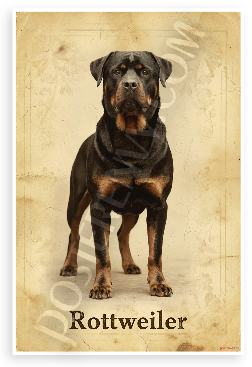 - Timeless Dog Portrait: Dignified Rottweiler stands proudly in vintage retro style with warm sepia tones, ornate floral borders, and aged paper effect creating an elegant, classic mood. Perfect for man caves, home offices, or pet-themed rooms