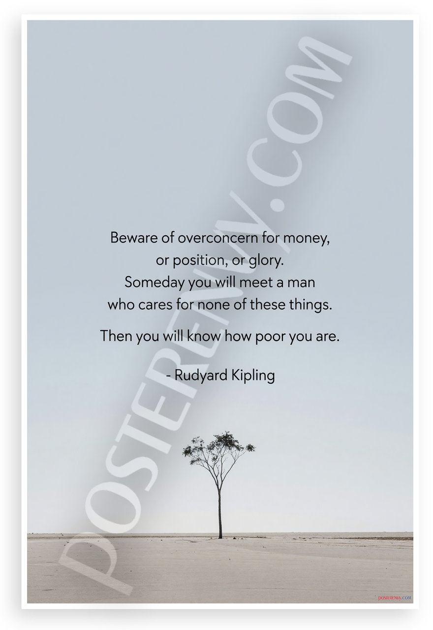 - Minimalist Design: Serene lone tree in barren landscape with Rudyard Kipling's quote on overconcern for money, position, glory. Creates contemplative mood, suits office, bedroom, study spaces.
