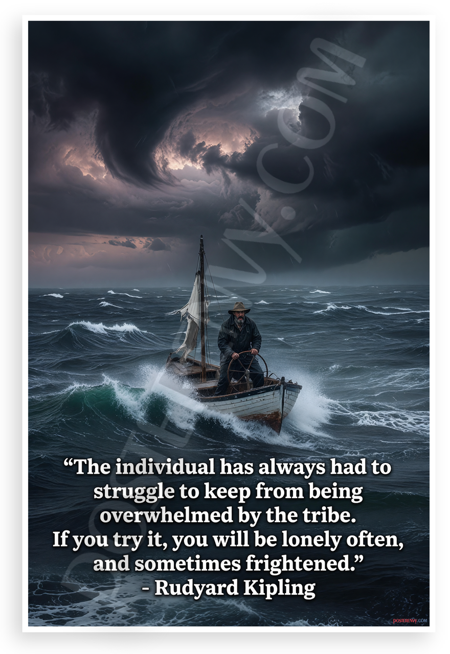 - Dramatic Stormy Sea Scene: Lone sailor in small boat battles rough ocean under turbulent clouds, paired with Rudyard Kipling quote on individuality. Creates moody, motivational atmosphere for office, study, or den.