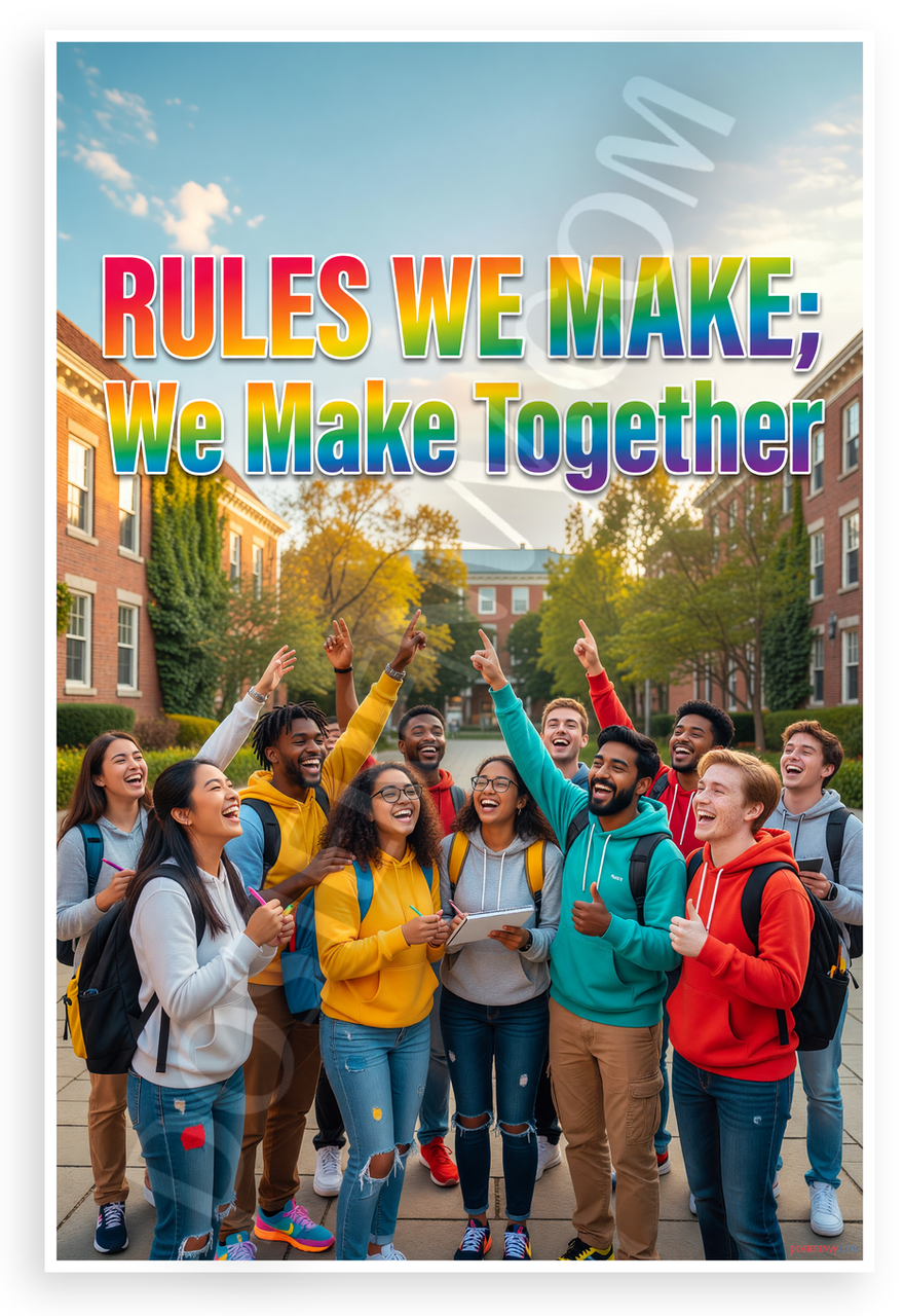 This 12x18 inch poster is printed on premium, durable paper. Proudly Made in the USA by PosterEnvy. The perfect size for any room. PosterEnvy is a family owned business, delivering top-notch posters around the world for over 20 years. Our posters are designed to last — they won't fade or pucker for years of enjoyment. Every poster features crisp, vivid artwork. We are a solar powered company. Featuring the empowering message 'RULES WE MAKE; We Make Together' in bold rainbow colors above a joyful group of diverse students celebrating on a campus quad with autumn trees and brick buildings. Ideal for fostering collaboration and inclusivity in classrooms.