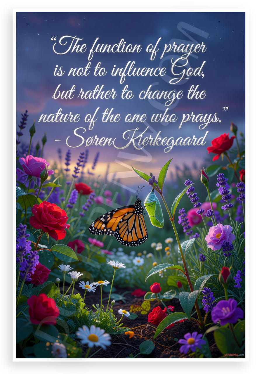 This 12x18 inch poster is printed on premium, durable paper. Proudly Made in the USA by PosterEnvy. The perfect size for any room. PosterEnvy is a family owned business, delivering top-notch posters around the world for over 20 years. Our posters are designed to last — they won't fade or pucker for years of enjoyment. Every poster features crisp, vivid artwork. We are a solar powered company. This inspirational poster features Søren Kierkegaard's profound quote on prayer overlaid on a vibrant twilight garden scene with a monarch butterfly emerging from its cocoon amid colorful flowers like roses, lavender, and daisies, symbolizing spiritual transformation and renewal.