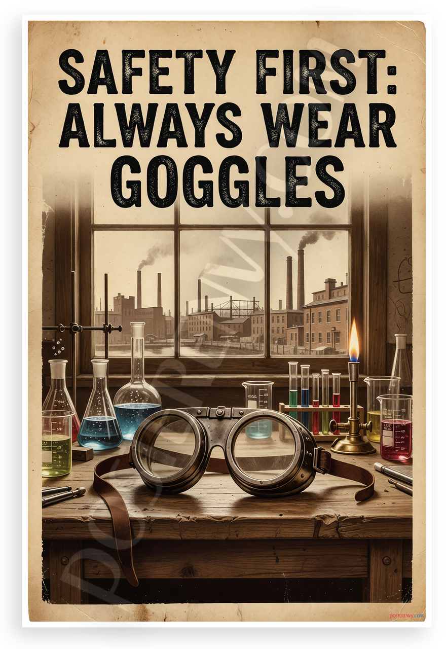 - Proudly Made in the USA: PosterEnvy is a Family owned business, delivering top-notch posters around the world for over 20 years safety first wear goggles lab equipment vintage style