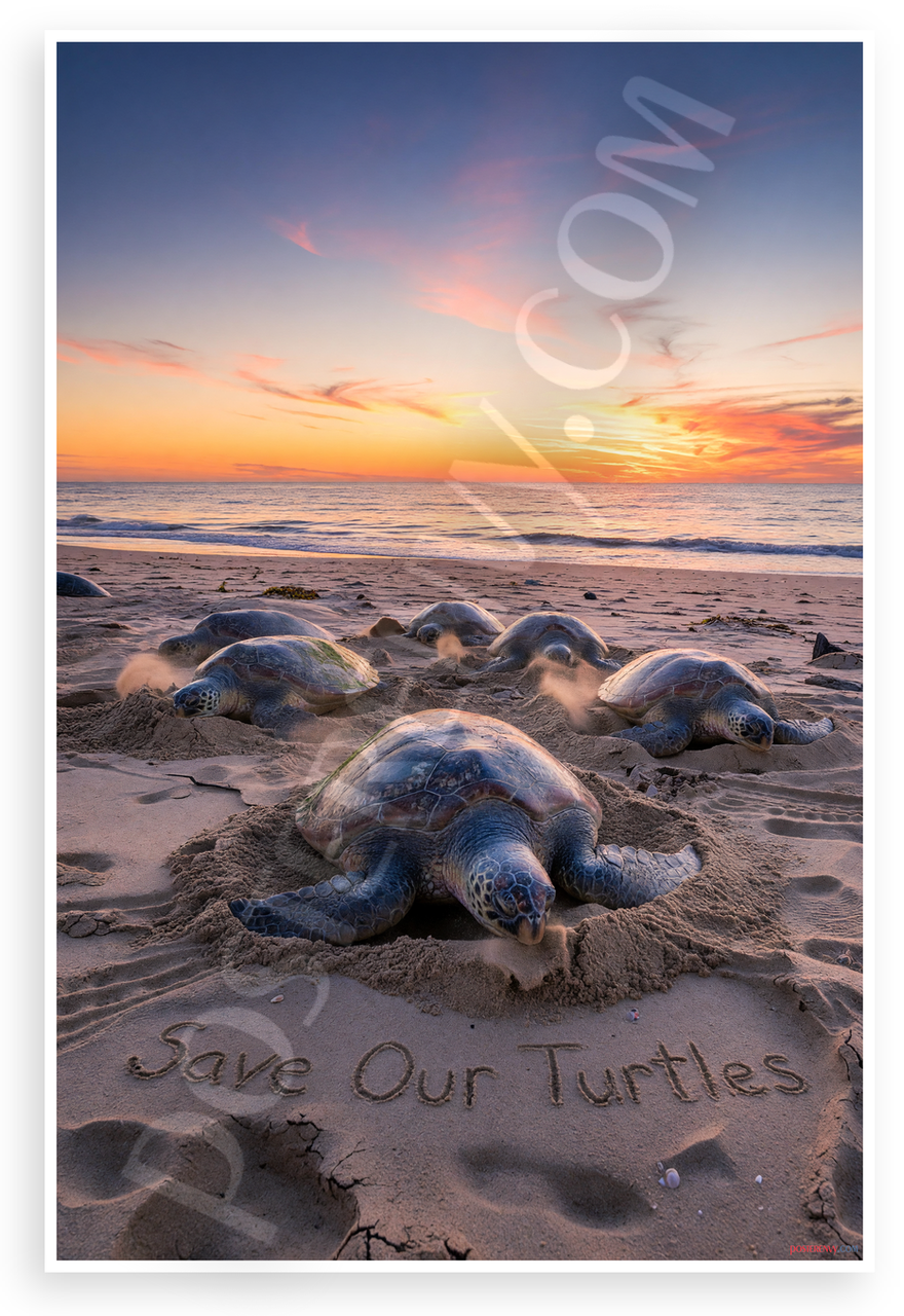 - Beach Nesting Scene: Vibrant dawn sunset over ocean with sea turtles emerging from sand nests, sand-written conservation message, serene optimistic mood for eco-friendly decor in homes or classrooms