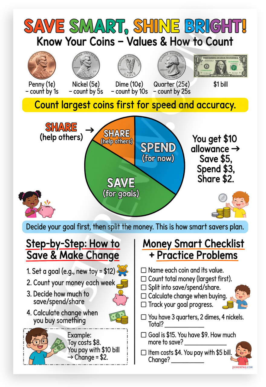 - Premium Print: This PosterEnvy 12x18 inch poster is printed on Durable, Heavy Duty Paper, Designed to last many years. Features Save Smart Shine Bright title, coin values penny nickel dime quarter dollar bill, pie chart save spend share, kids money management checklist and practice problems