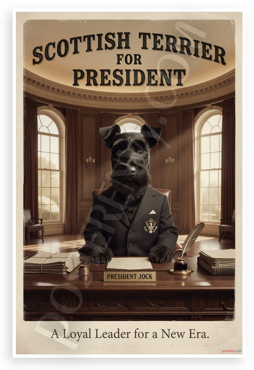 - Humorous Presidential Scene: Vintage poster shows anthropomorphic Scottish Terrier in suit at Oval Office desk, evoking nostalgia and fun. Ideal for dog lover homes, offices, or man caves with warm sepia tones and detailed presidential elements.