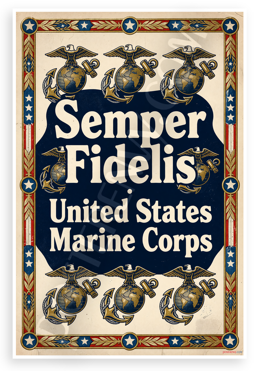 This 12x18 inch poster is printed on premium, durable paper. Proudly Made in the USA by PosterEnvy. The perfect size for any room. PosterEnvy is a family owned business, delivering top-notch posters around the world for over 20 years. Our posters are designed to last — they won't fade or pucker for years of enjoyment. Every poster features crisp, vivid artwork. We are a solar powered company. This vintage-style poster showcases 'Semper Fidelis United States Marine Corps' in bold typography, surrounded by iconic eagle, globe, and anchor emblems with a patriotic frame evoking pride and loyalty.