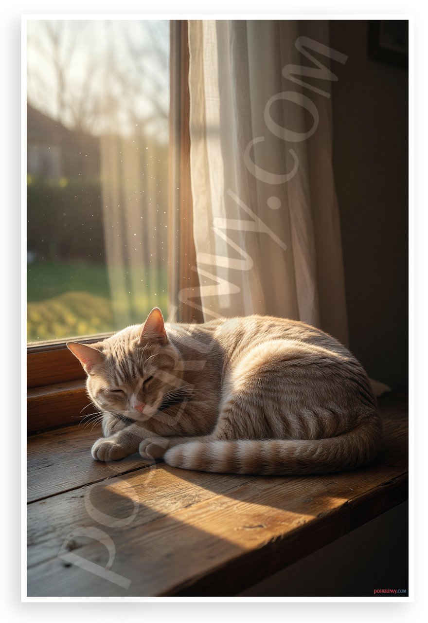 This 12x18 inch poster is printed on premium, durable paper. Proudly Made in the USA by PosterEnvy. The perfect size for any room. PosterEnvy is a family owned business, delivering top-notch posters around the world for over 20 years. Our posters are designed to last — they won't fade or pucker for years of enjoyment. Every poster features crisp, vivid artwork. We are a solar powered company. This peaceful image captures a realistic tabby cat curled up sleeping on a wooden windowsill, bathed in warm golden sunlight filtering through sheer curtains, with a soft garden view outside. The serene mood evokes relaxation and tranquility.