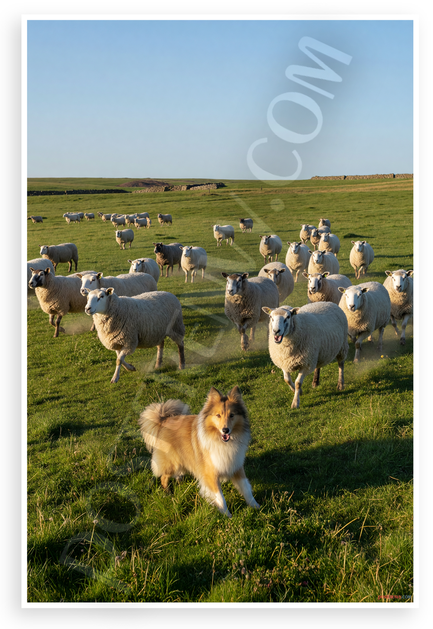 - Dynamic Farm Scene: Vibrant photograph of Shetland Sheepdog directing white sheep across green fields with blue sky overhead, conveying energy and purpose. Ideal for kitchens, farmhouses, or pet-themed rooms