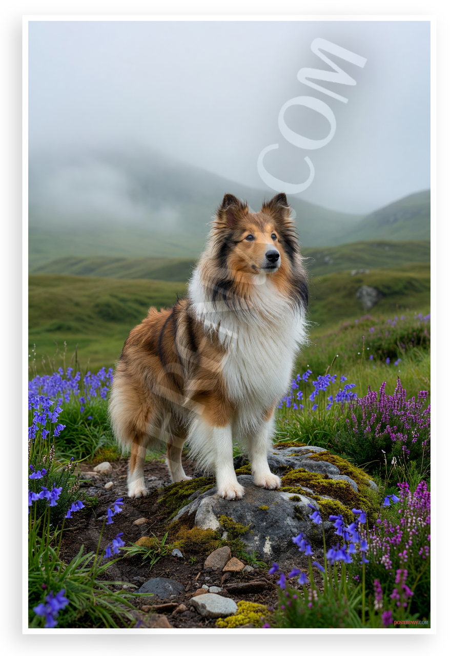 - Majestic Dog in Misty Landscape: Vibrant portrait of proud Shetland Sheepdog on rocky outcrop amid wild purple flowers and foggy Scottish hills creates serene, adventurous mood. Ideal for living room, bedroom, or pet lover office
