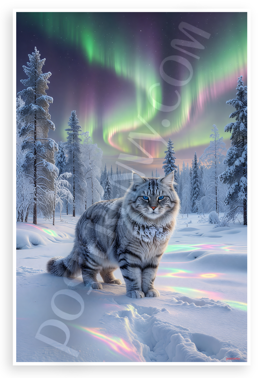 - Solar Powered Production: All our posters are designed and printed using solar energy, with crisp vivid artwork. Aurora borealis cat surreal wilderness forest snow scene